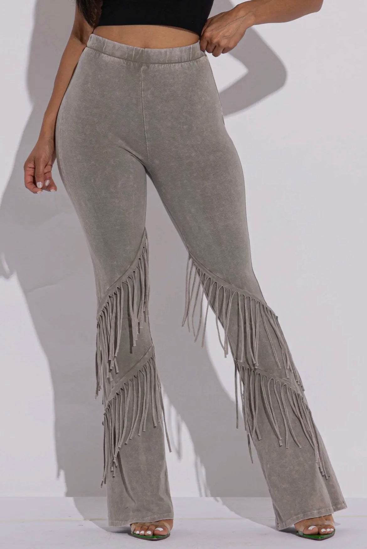 Elevate your style with these bohemian chic pants which feature a trendy mineral wash and playful flare legs with fringe details. Embrace your inner free spirit and stand out in these fashionable and flattering pants. ** Delivery: 2-3 weeks