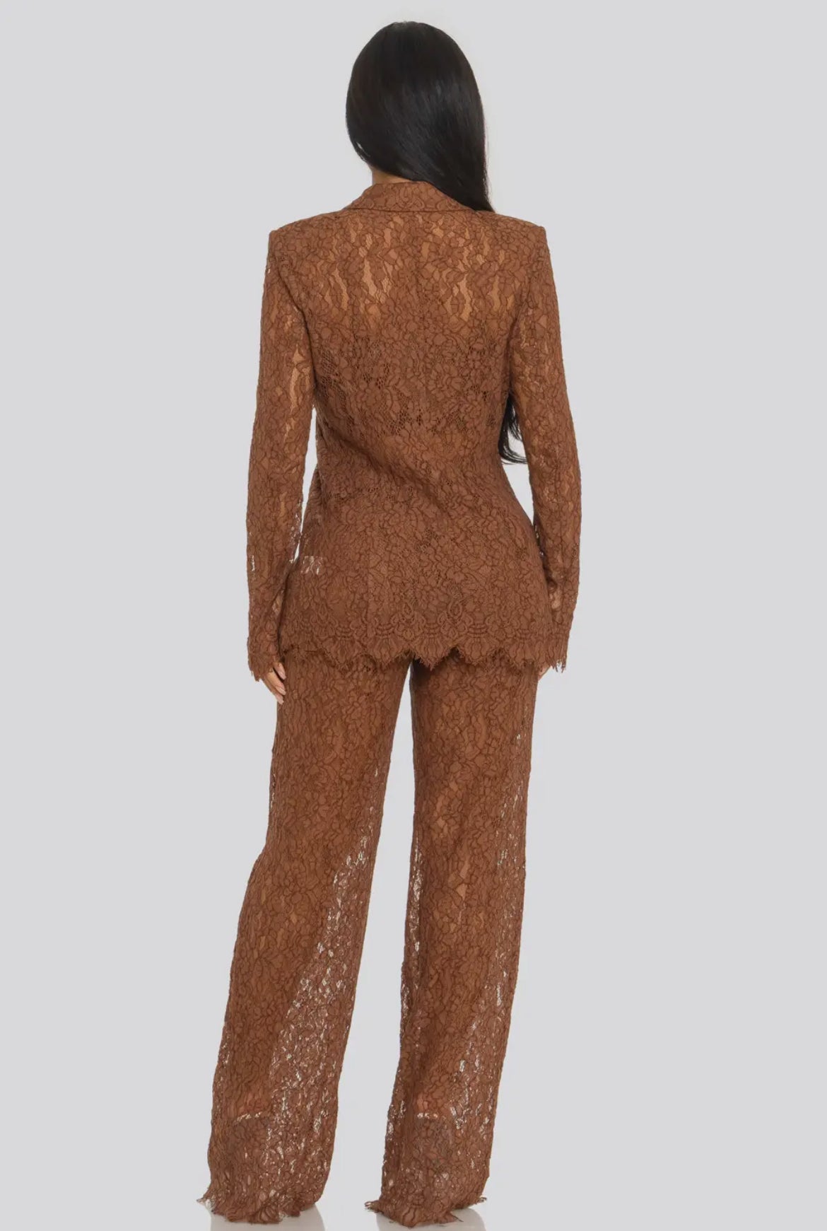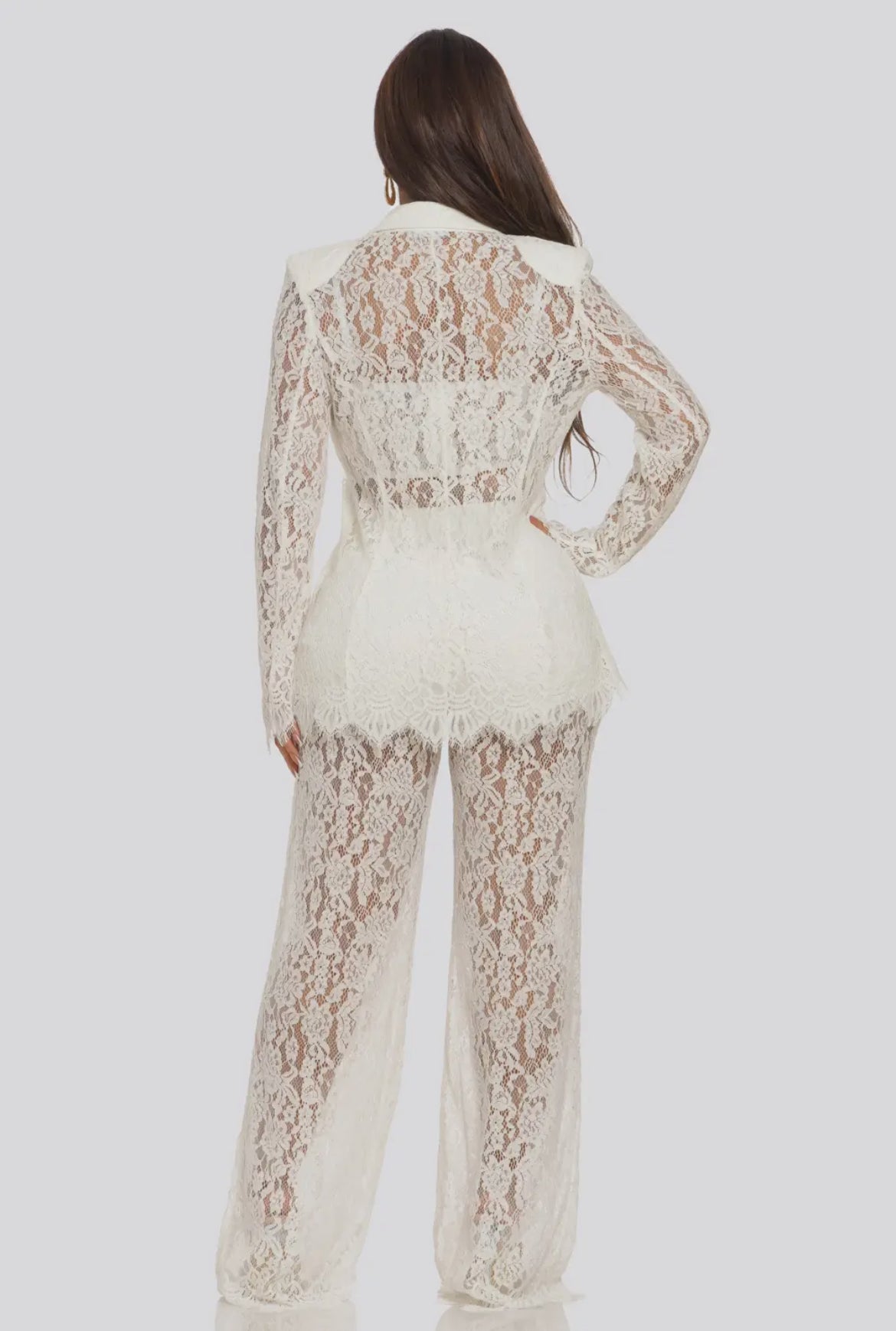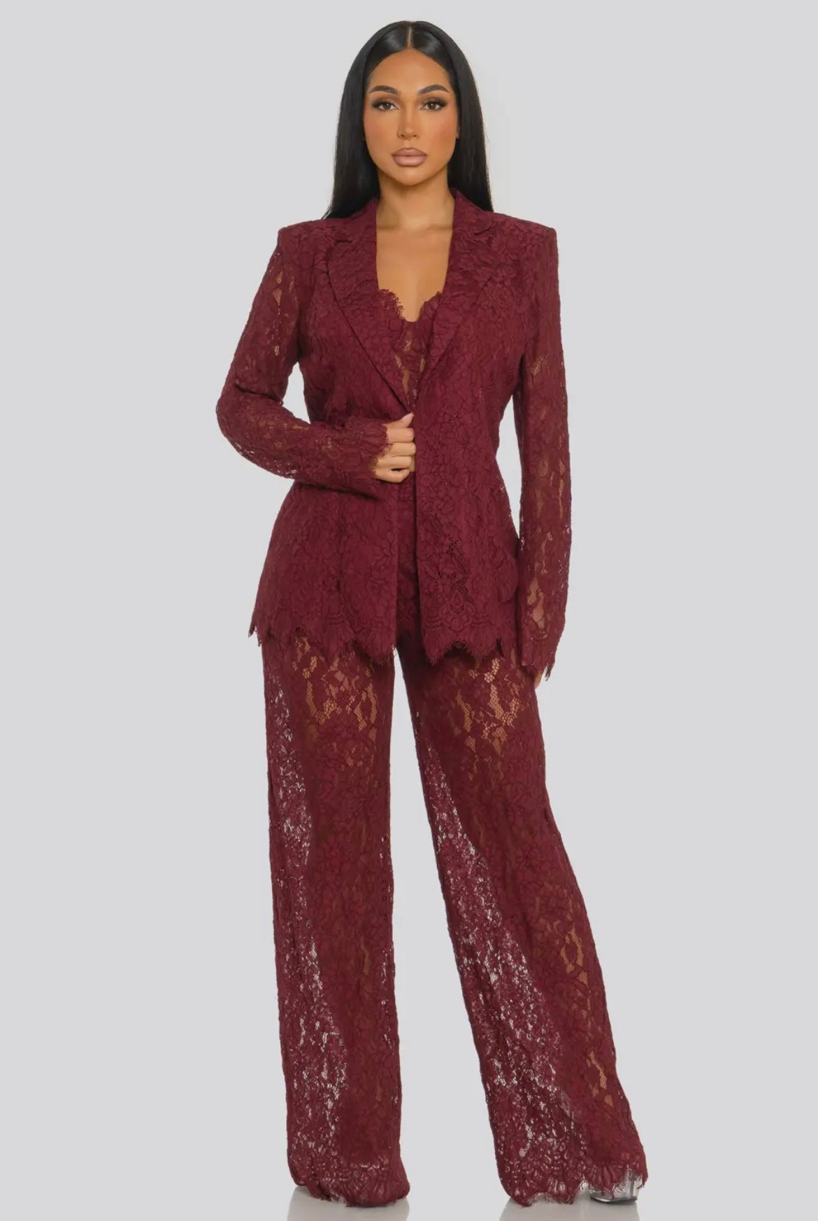 The Kate Lace Set comprises a three-piece ensemble featuring a floral lace bandeau, coordinating blazer, and wide-leg pants. This sophisticated outfit combines comfort and elegance, with lace construction that allows for breathability while maintaining a refined aesthetic. Ideal for formal occasions, it enhances the wearer’s silhouette effectively. ***Delivery: 2-3 weeks