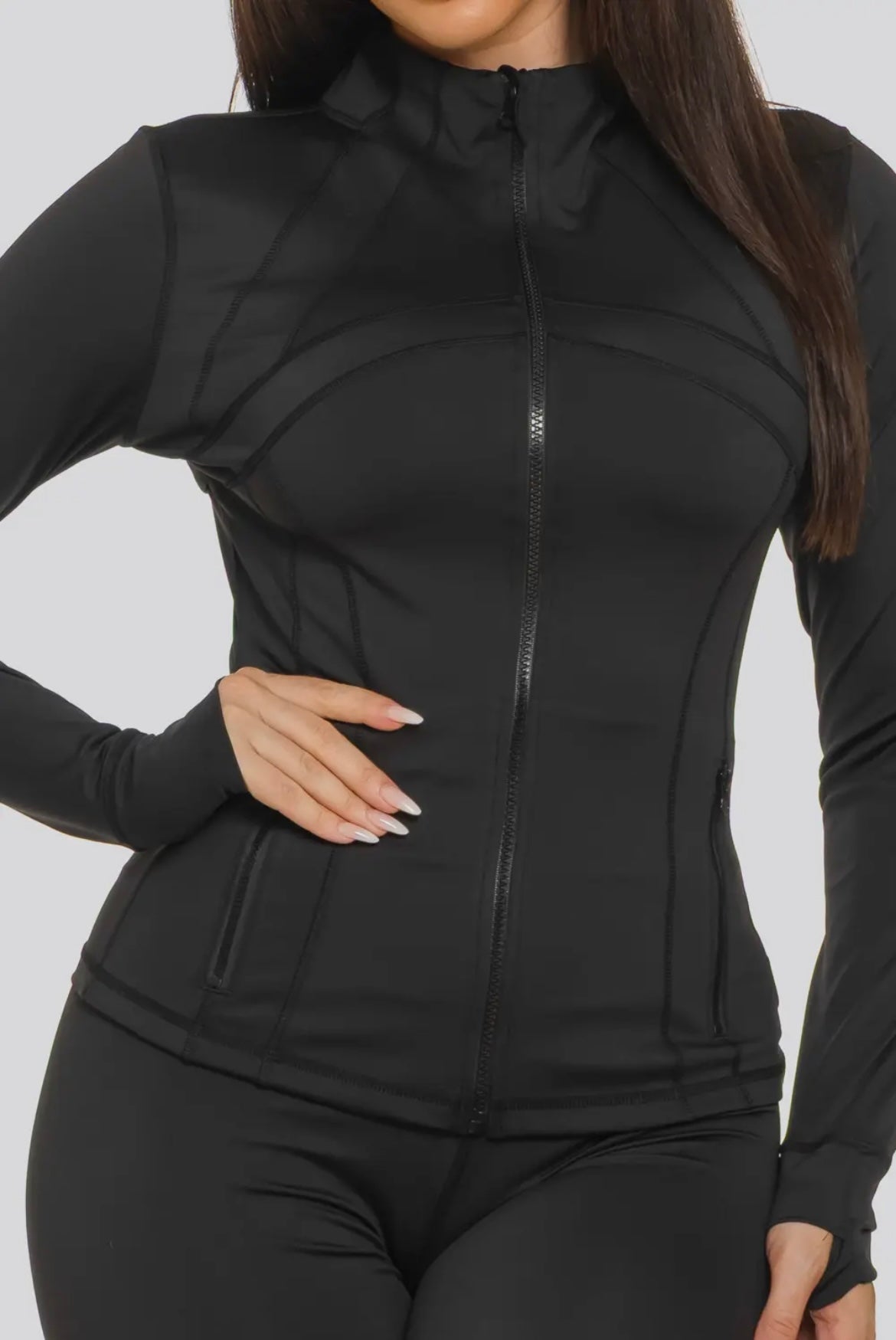 Constructed with a solid front zip up design, this leggings set features a mock neck detail and open thumb holes for added comfort. Equipped with side zipper pockets, this jacket top and leggings set is perfect for any activity. Model is 5’7 and has a bust measurement of 35”, waist measurement of 25”, and hip measurement of 40”. Made with 80% polyester and 20% spandex materials. * Delivery: 2-3 weeks