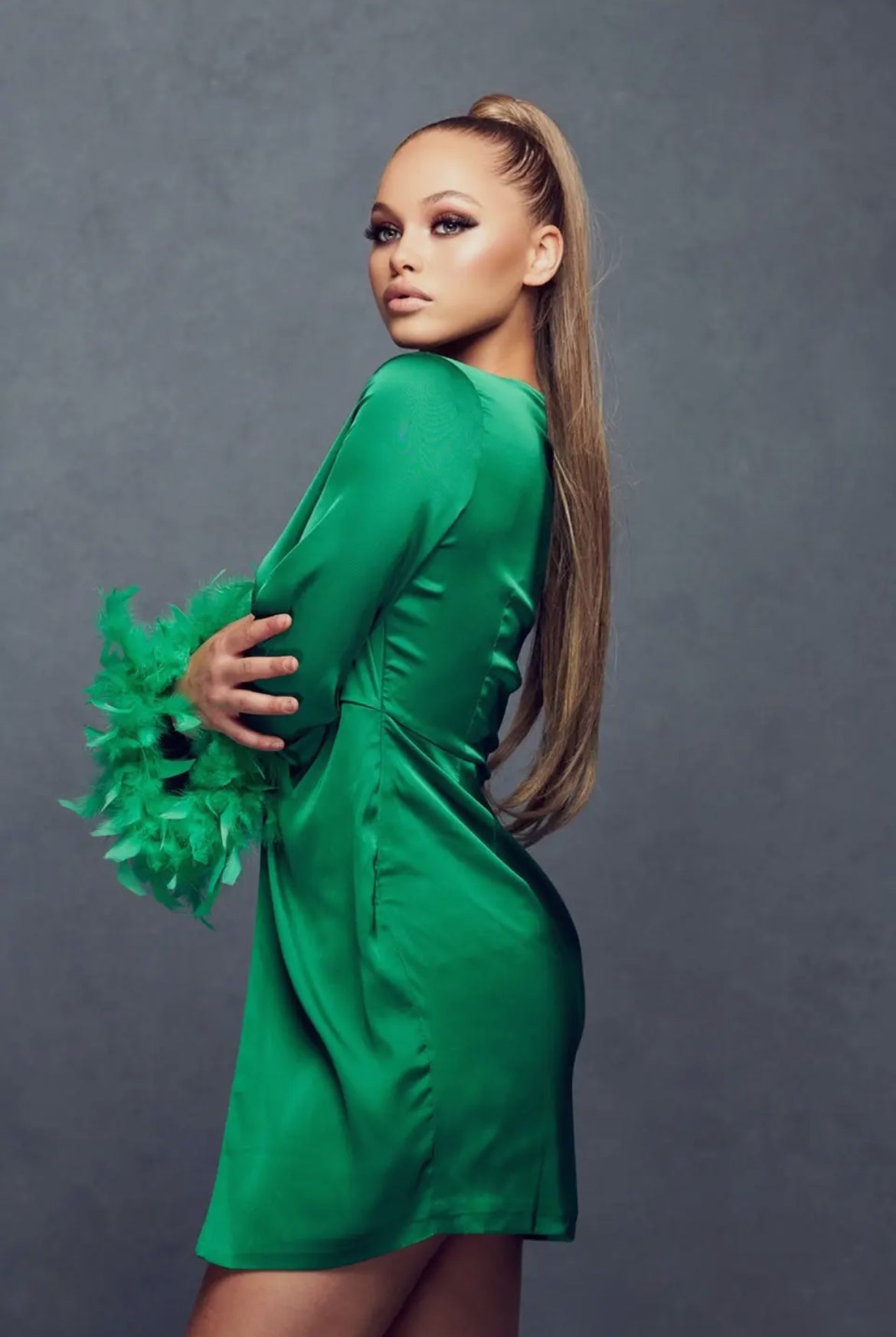 The satin mini dress is designed with a front twist detail, a high front slit, long sleeves, a side zipper closure, and ostrich feather cuffs, exhibiting minimal elasticity. It is advisable to select a size larger than your usual fit for optimal comfort.