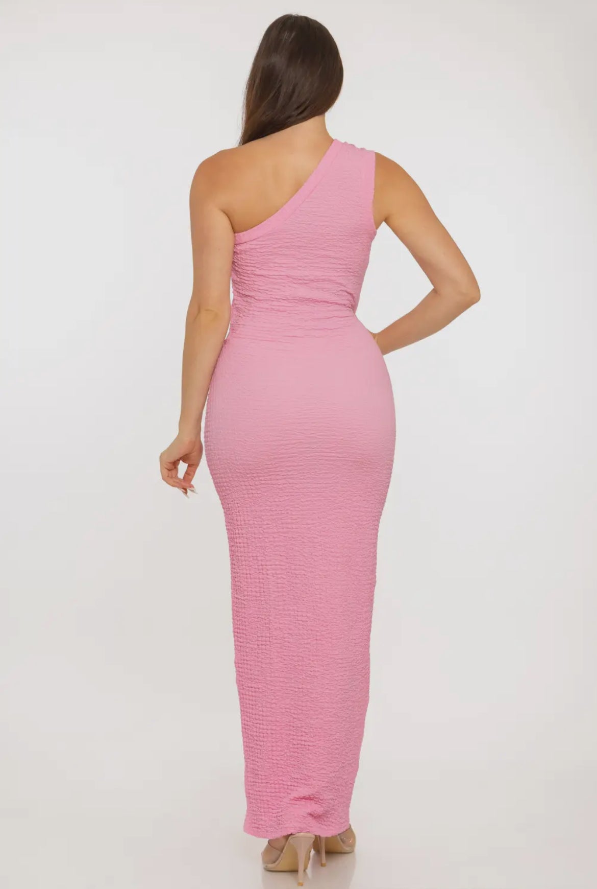 Step into the spotlight with the Selena Sunflower Dress! Crafted from crinkle texture fabric, this stunning one-shoulder maxi dress features a chic side O-ring detail that adds a bold touch. Feel the confidence radiate as you embrace the perfect blend of elegance and modernity. Shine bright and make every moment unforgettable! 95% Polyester 5% Spandex. Model 5’7 Bust 33”, Waist 25”, Hips 40”
