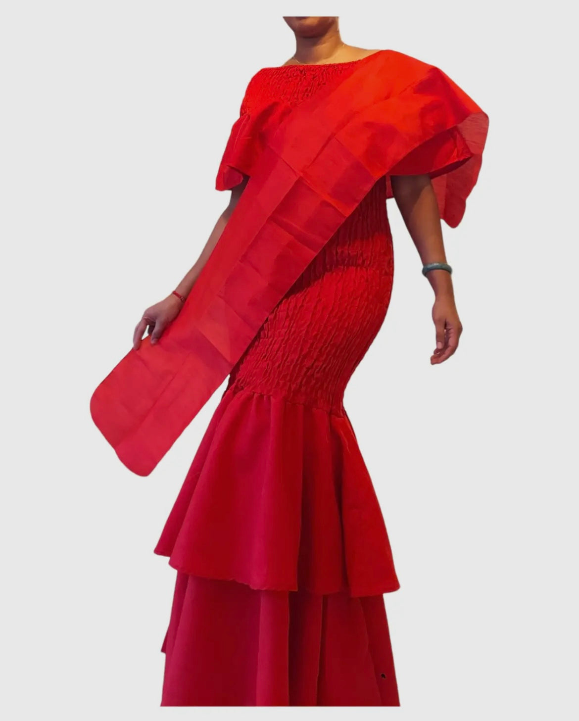 Faux silk smock mermaid dress with smocked bodice all around, double layered flared bottom with mid length bell sleeves and square neck with matching scarf. One size fits M-2XL. **Delivery: 1-2 weeks