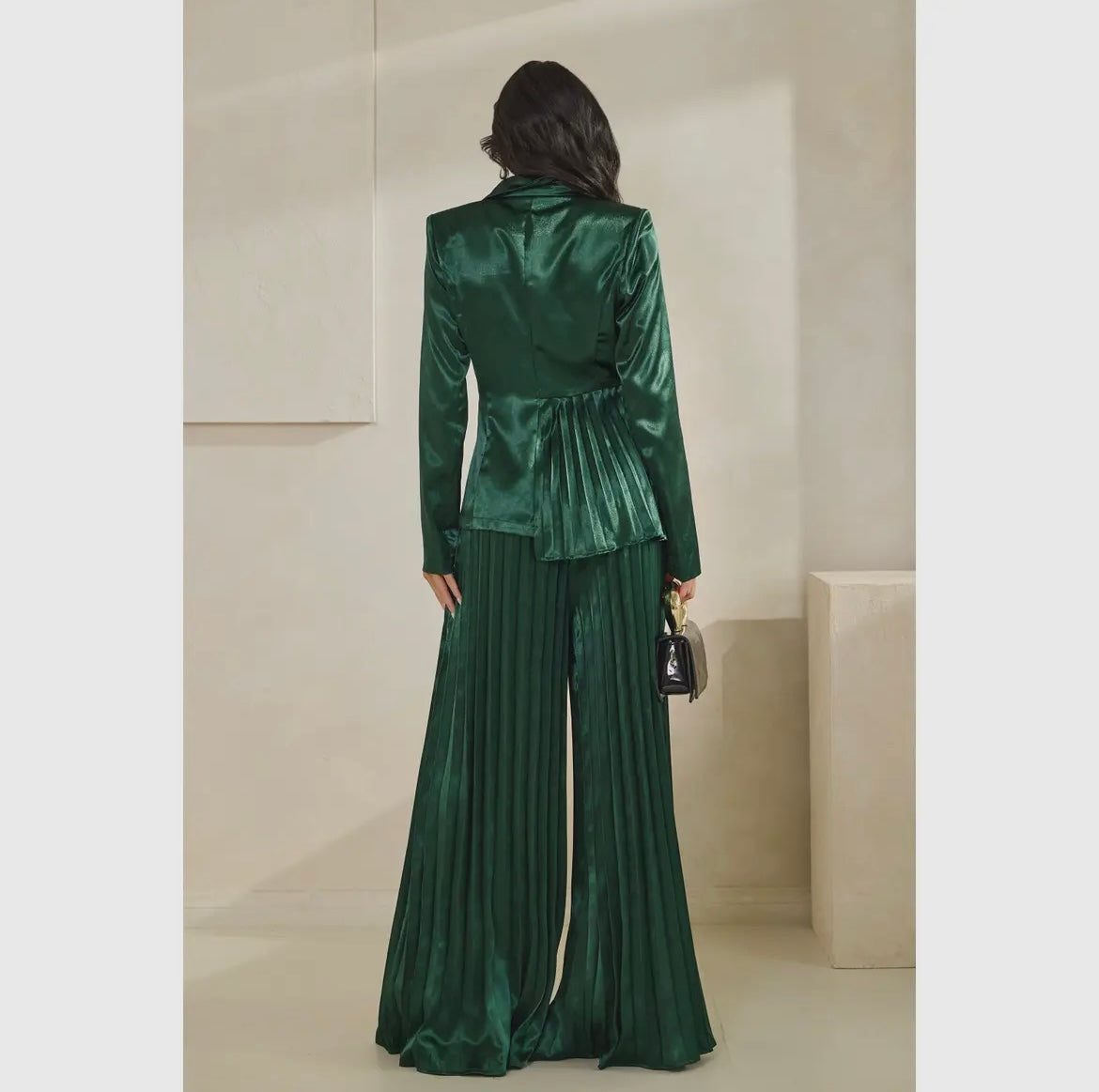 Elevate your work wardrobe with our Eve Pants Set. This sleek two-piece set features a flattering fit and trendy pleated design on the wide pant legs. The blazer, with its shiny fabric and rhinestone button enclosure, exudes sophistication, while the shoulder pads add a timeless touch. Blazer has an irregular pleating hem detail. Upgrade your style game with this chic and professional set. Polyester 100% *Delivery: 2-3 weeks